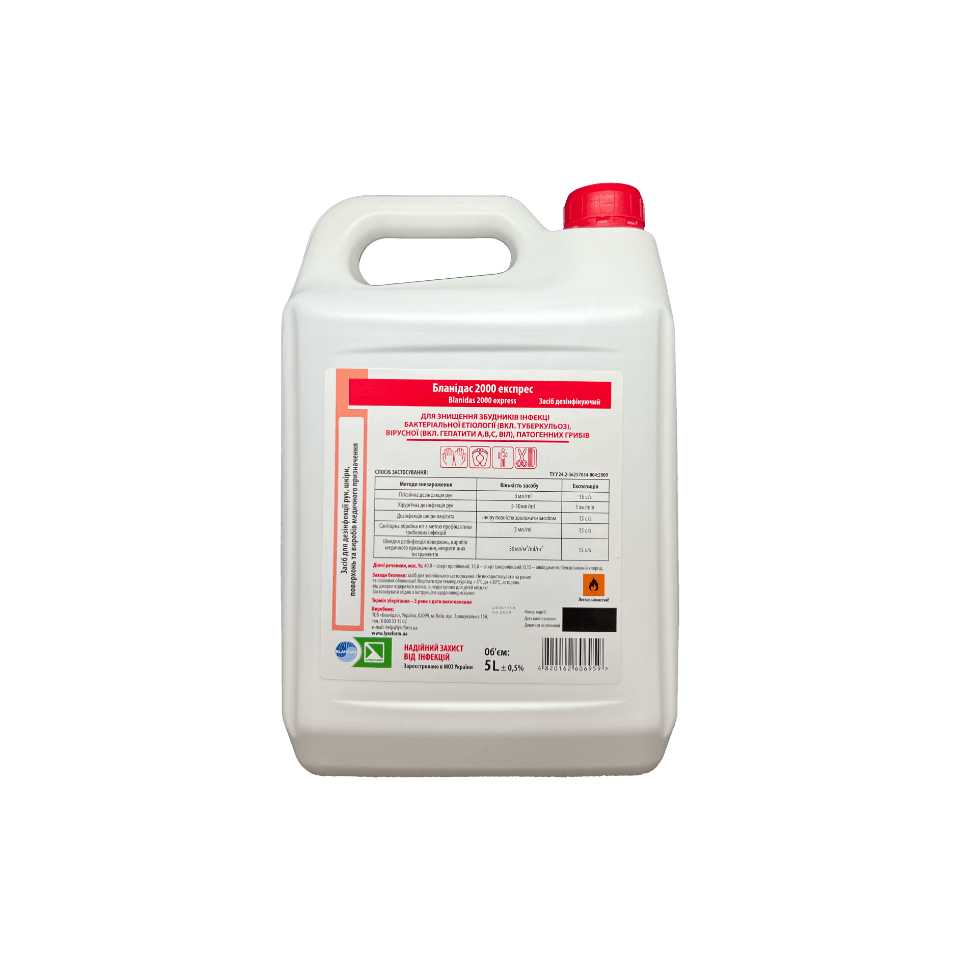 Дезінфікуючі засоби для рук Бланідас 2000 експрес, 5л Бланідас 2000 експрес, 5л Дезінфікуючий засіб для гігієнічної обробки рук і шкіри, а також для швидкої дезінфекції невеликих поверхонь та виробів.   Властивості: містить комплекс догляду за шкірою; захищає шкіру рук від сухості і подразнень; зберігає еластичність і природний водно-жировий баланс шкіри.   Сфера застосування: Рекомендовано для дезінфекції рук медичного персоналу закладів охорони здоров’я, ліктьових згинів донорів, обробки шкіри операційного, ін’єкційного поля, обробки шкіри під час інвазивних методів діагностики та лікування пацієнтів, а також деконтамінації шкіри рук персоналу харчової промисловості, громадського харчування та торгівлі, інших комунальних об’єктів, фармацевтичної та парфумерно-косметичної промисловості, закладів соціального захисту та інших об’єктів, діяльність яких вимагає дотримання санітарно-гігієнічних норм і правил, в домашніх умовах при догляді за хворими, новонародженими, літніми людьми тощо. 972.00