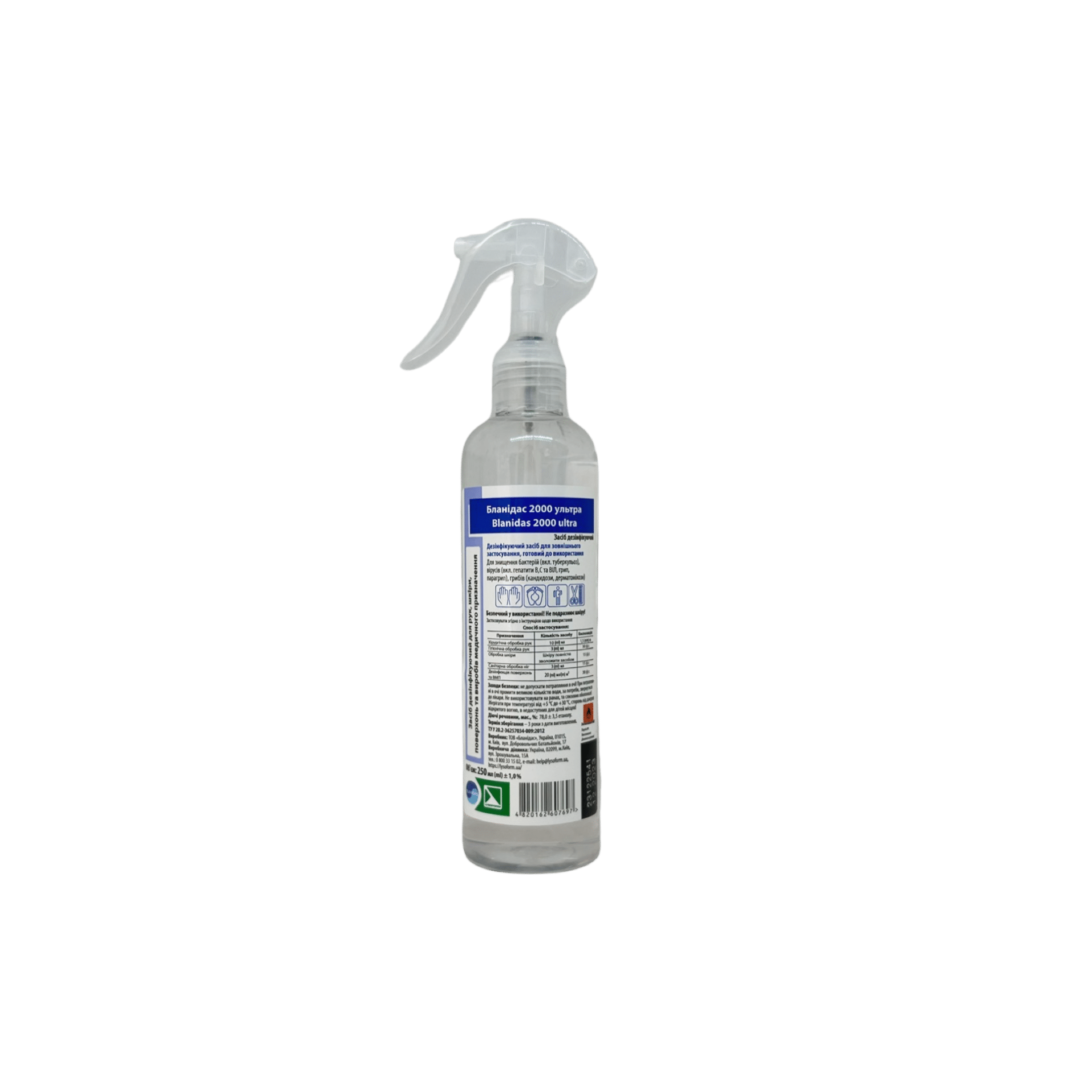Дезінфікуючі засоби для рук Бланідас 2000 ультра, 250мл Бланідас 2000 ультра, 250мл Дезінфікуючий засіб для гігієнічної обробки рук і шкіри, а також для швидкої дезінфекції невеликих поверхонь та виробів.   Властивості: не викликає подразнень і алергічних реакцій шкіри; комплекс догляду за шкірою захищає шкіру рук від сухості і подразнень, зберігає еластичність і природний водно-жировий баланс шкіри; засіб має пролонговану дію протягом 3-х годин.   Сфера застосування: Рекомендовано для дезінфекції рук медичного персоналу закладів охорони здоров’я, ліктьових згинів донорів, обробки шкіри операційного, ін’єкційного поля, обробки шкіри під час інвазивних методів діагностики та лікування пацієнтів, а також деконтамінації шкіри рук персоналу харчової промисловості, громадського харчування та торгівлі, інших комунальних об’єктів, фармацевтичної та парфумерно-косметичної промисловості, закладів соціального захисту та інших об’єктів, діяльність яких вимагає дотримання санітарно-гігієнічних норм і правил, у домашніх умовах при догляді за хворими, новонародженими, літніми людьми тощо. 122.00