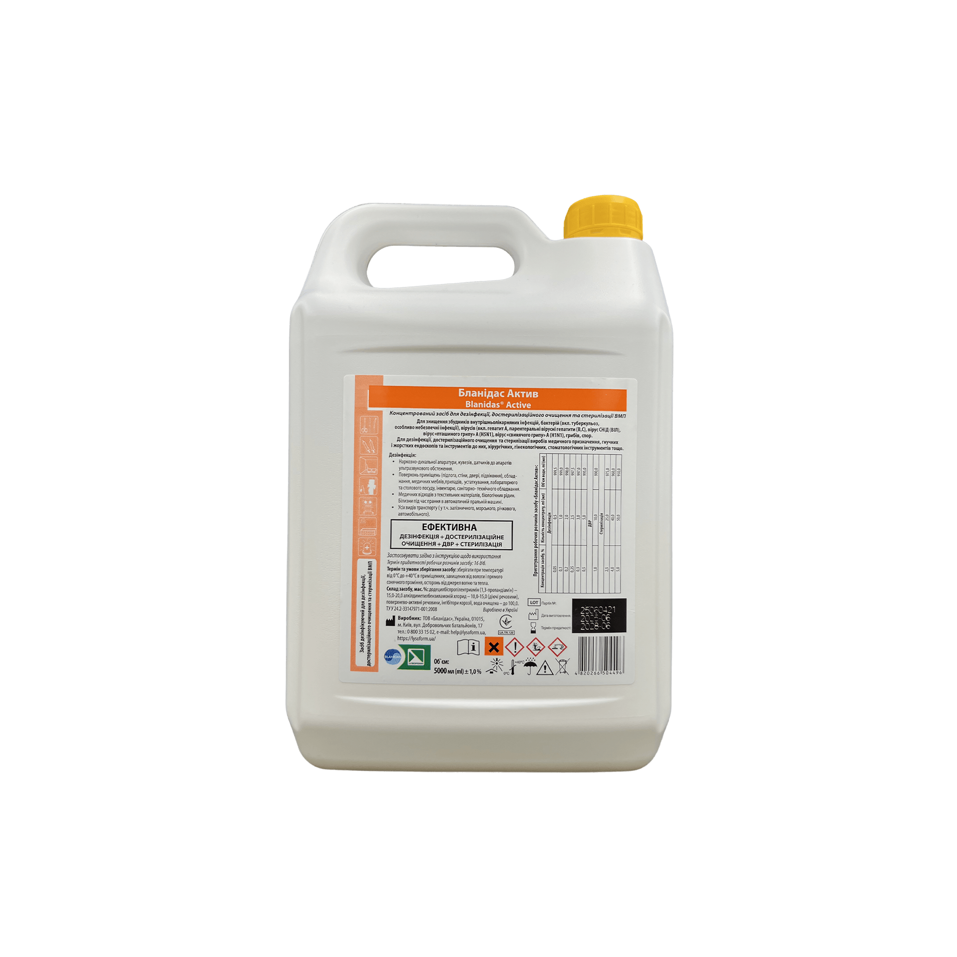 Концентрати миючих засобів Бланідас Актив, 5л Бланідас Актив, 5л Універсальний безальдегідний нехлорний засіб для знезараження медичних виробів (дезінфекція + достерилізаційне очищення + стерилізація), для поточної, заключної, профілактичної дезінфекції і одночасного миття усіх типів поверхонь, для проведення генеральних прибирань.   Властивості: рекомендований для знезараження обладнання з особливо чутливих матеріалів; відсутність запаху; має миючі властивості (85%); можливість використання в присутності пацієнтів, відвідувачів; термін зберігання невикористаного робочого розчину засобу становить 16 діб; має бактерицидну, туберкулоцидну, віруліцидну, фунгіцидну, спороцидну дію;   Сфера застосування: Дезінфекція, достерилізаційне очищення і стерилізація ВМП багаторазового і одноразового використання, ендоскопів, наркозно-дихальної апаратури, кувезів для новонароджених, відпрацьованих матеріалів тощо. Дезінфекція і очищення всіх типів поверхонь в приміщеннях, медичних пристроїв та устаткування, посуду, інвентарю тощо у закладах охорони здоров’я і лікувально-профілактичних закладах усіх профілів, у тому числі дитячих і денних стаціонарах, відділеннях неонатології, палатах, блоках і відділеннях інтенсивної терапії для новонароджених, маніпуляційних, операційних, перев’язувальних кабінетах, хірургічних, терапевтичних, педіатричних, акушерських, гінекологічних, офтальмологічних, фізіотерапевтичних відділеннях лікувально-профілактичних закладів, пологових будинках, поліклініках, стоматологічних клініках і кабінетах, шпиталях, амбулаторіях, диспансерах, фельдшерських і фельдшерсько-акушерських пунктах, центрах з трансплантації органів, медсанчастинах і медпунктах, станціях швидкої медичної допомоги, донорських пунктах, відділеннях переливання крові, карети швидкої медичної допомоги, патолого-анатомічних відділеннях, санаторіях, профілакторіях, реабілітаційних центрах, хоспісах, закладах соціального захисту населення, санпропускниках, закладах судово-медичної експертизи, медичних профільних центрах, клінічних, мікробіологічних, біохімічних, бактеріологічних, вірусологічних, серологічних та інші профільних діагностичних лабораторіях тощо.   Будьте обачні! Одягайте захисні рукавички при використанні побутової та професійної хімії, а у разі застосування аерозольних засобів – захисні окуляри. 2251.00