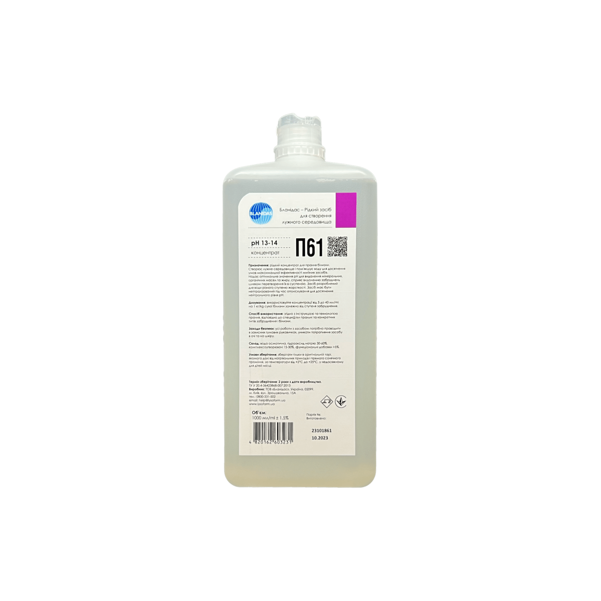Рідкий концентрат для прання білизни. Створює лужне середовище та пом’якшує воду для досягнення умов максимальної ефективності миючих компонентів. Надає оптимальний рівень рН для видалення забруднень, видаляє мінеральні, органічні масла та жири, сприяє видаленню забруднень шляхом перетворення їх в суспензію. Засіб розроблений для жорсткої води. Засіб має бути нейтралізований під час ополіскування для досягнення оптимального рівня рН за допомогою засобу для пом’якшення білизни. Вода осмотична, гідроксид натрію 15-30%, етилендіамінтетраоцтова кислота, тетранатрієва сіль 5-15%, полікарбоксилати <5%, фосфонати <5%, карбоксіметилцелюлоза натрієва сіль <5%