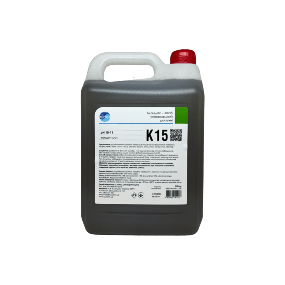 Рідкий мийний засіб для всіх видів водостійких поверхонь кухні, включаючи столи, стільці, підлогу, стіни та обладнання.