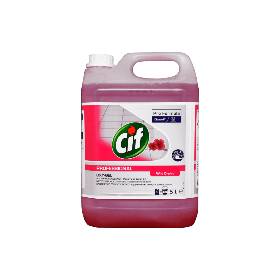 Cif Professional Oxy-Gel Wild Orchid – це рідкий концентрований препарат для миття підлог та інших водостійких поверхонь, що миються. Продукт рекомендований для миття керамічних поверхонь, поверхонь із пластмас або поверхонь, пофарбованих олійною фарбою, підлог, стін, ламінату тощо. Cif Professional Oxy-Gel Wild Orchid – дозволяє ефективно видалити різні забруднення, у тому числі від жиру, а також товсті шари забруднення. Данний продукт під час процесу миття випускає активний кисень у вигляді бульбашок, які швидко та ефективно відокремлюють забруднення від поверхонь, що миються, після чого поглинаються шваброю, ганчіркою чи губкою. Продукт залишає свіжий, приємний запах.