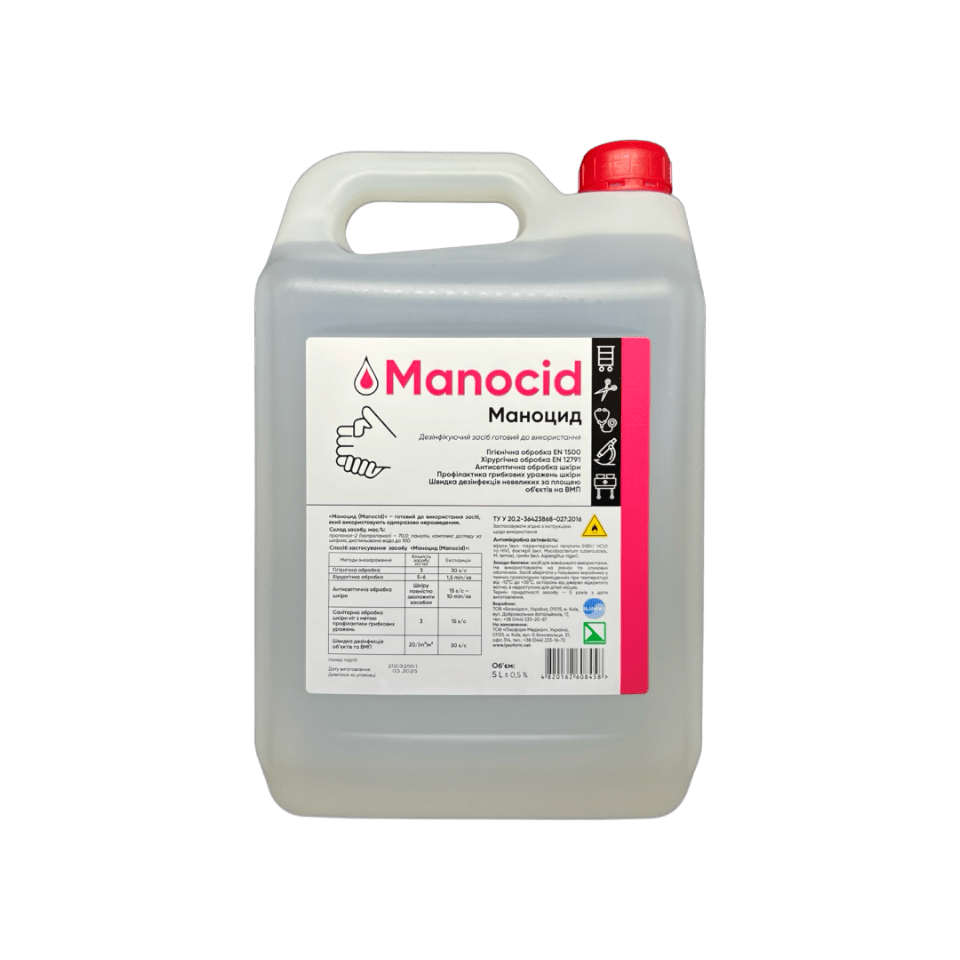 Дезінфікуючі засоби для рукМаноцид, 5лДезінфікуючий засіб призначений для гігієнічної та хірургічної обробки рук і шкіри, а також для швидкої дезінфекції невеликих поверхонь, виробів медичного призначення, включаючи некритичні інструменти, рукавички та інші невеликі за розмірами об’єкти.