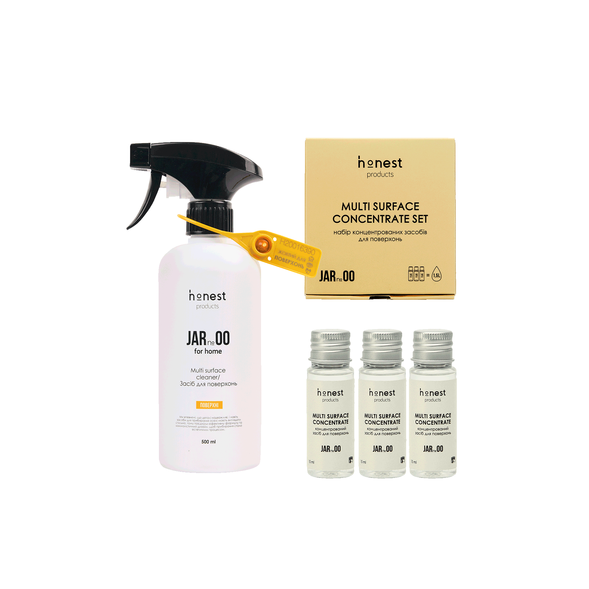 JAR №00 — набір концентратів для очищення поверхонь. Складається з трьох флаконів по 15 мл, кожен з яких легко розводиться у 500 мл води, створюючи ефективний засіб з приємним ароматом білих квітів, меду та свіжоскошеної трави.