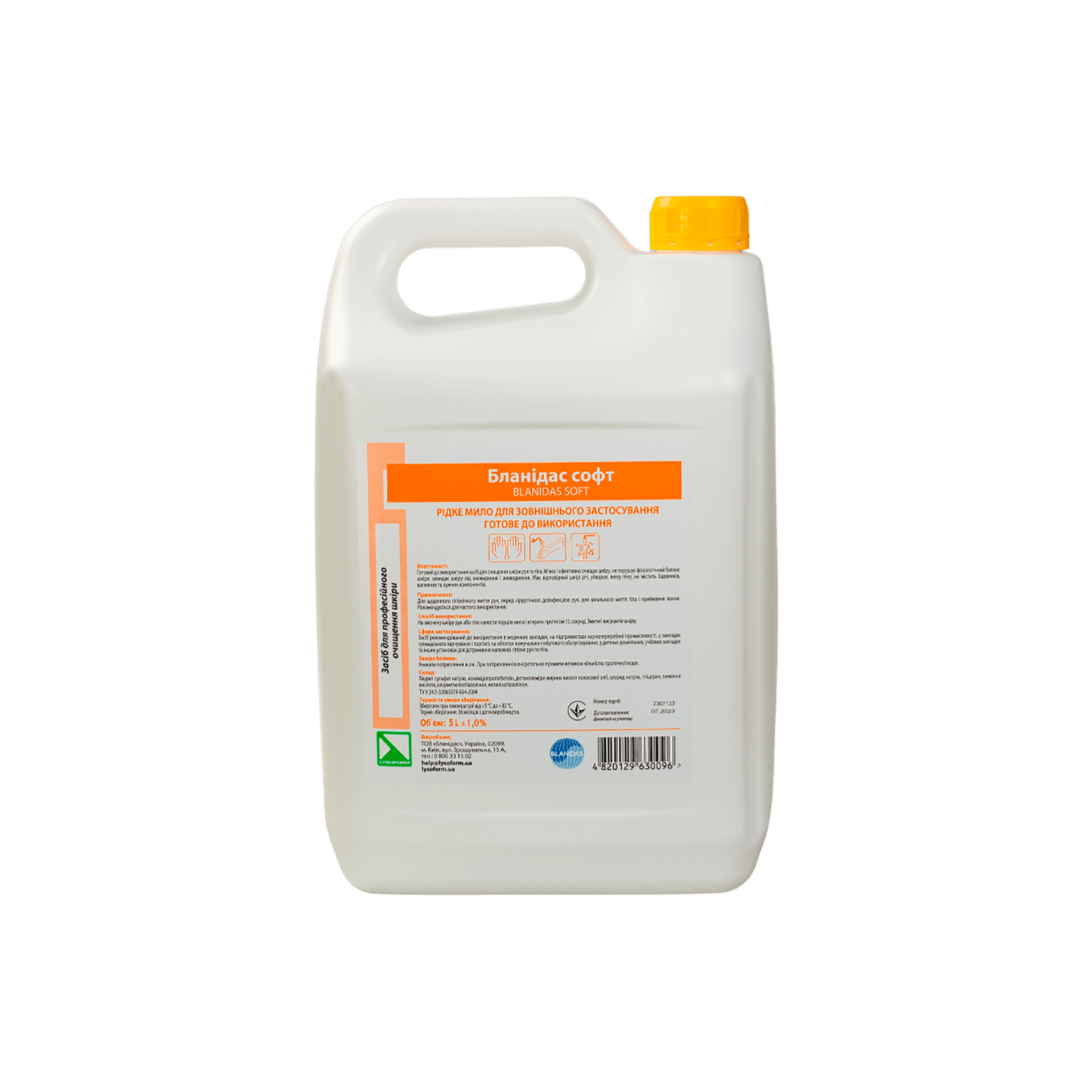 Жидкое мыло Бланидас Софт, 5л Бланидас Софт, 5л Мягко и эффективно очищает кожу, не нарушает физиологический баланс, защищает от обезжиривания и обезвоживания. Обладает pH, соответствующим коже, образует лёгкую пену, не содержит известковых и щелочных компонентов.   Свойства: готовое средство; не вызывает раздражений и аллергических реакций кожи; содержит систему защиты и смягчения кожи.   Сфера применения: Гигиеническое мытье рук во всех областях медицины, домашних условиях, отраслях коммунально-бытового обслуживания и т.п. Гигиеническое мытье тела пациента перед оперативным вмешательством в учреждениях здравоохранения различного профиля, на предприятиях фармацевтической, химической, биотехнологической, микробиологической, пищевой и перерабатывающей промышленности, предприятиях коммунального хозяйства, общественного питания и торговли, на всех видах транспорта, в учебных и дошкольных заведениях, быту и в других заведениях, где нужно соблюдать надлежащую гигиену. 338.00