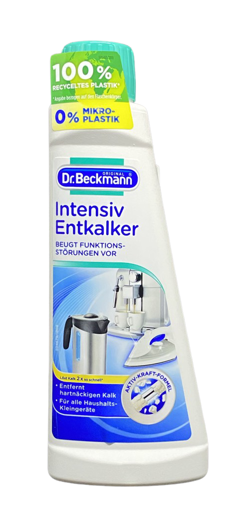 Средства для удаления накипи Dr. Beckmann Интенсивный антинакипин, 250 мл Dr. Beckmann Интенсивный антинакипин, 250 мл Dr. Beckmann Интенсивный антинакипин Если вы беспокоитесь о долговечности работы электроприборов, то применение интенсивного антинакипина Dr. Beckmann поможет вам забыть о таких страхах. Очищение устройств с таким средствам продлит срок службы и сохранит чистоту.   Средство подходит для очищения электрочайника, автоматической кофеварки и других приборов. Необходимо учитывать то, что антинакипин способен повредить поверхности, которые чувствительны к воздействию кислот. Например, мрамор, серебро или эмаль. Если у устройства есть водный фильтр, его необходимость снять перед использованием средства. После этого установить на место.   Состав: < 5% фосфонаты.   Способ использования: – Кофеварки, автоматические кофеварки: В резервуар для воды налейте 500 мл воды и добавьте 50 мл (1/2 стакана) антинакипина. При сильных загрязнениях или для больших приборов количество средства увеличить. Включите прибор и программу по удалению накипи, соответственно, для кофеварки включите обычный режим работы. После удаления накипи прибор дважды промойте водой. – Электрические чайники: 50 мл раствора (~ 1/2 стакана) налейте в чайник, потом добавьте 500 мл воды. НЕ нагревать. Образуются пузыри. Электрический чайник является очищенный от накипи в тот момент, когда пузырьки исчезнут. При сильном накипи налейте 100-150 мл средства, затем добавьте воду к краю загрязнения и оставьте на 10-15 минут. После очистки раствор вылить и чайник основательно промыть водой. – Утюги, пароварки, яйцеварки: Для удаления накипи придерживайтесь соответствующим указаниям производителя. 0