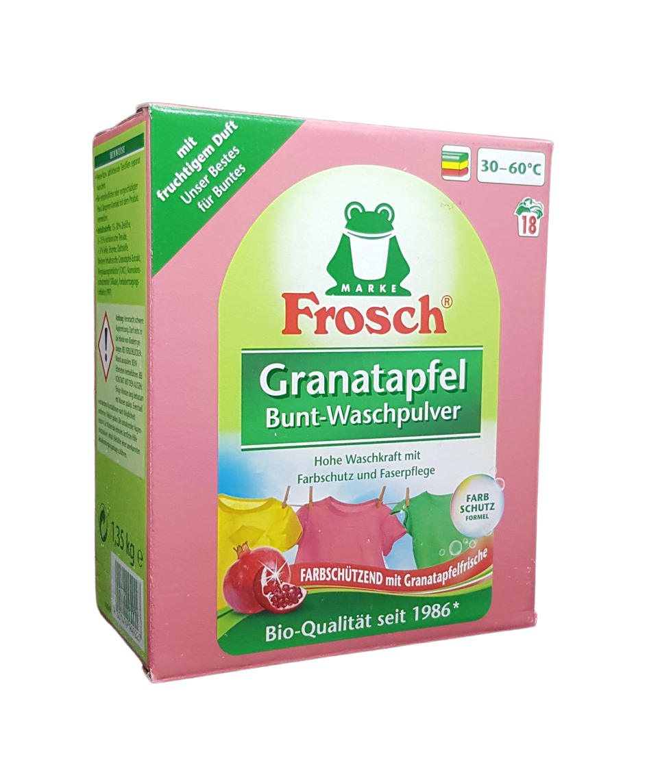 Стиральные порошки Frosch Стиральный порошок-концентрат Колор Гранат, 1.35кг Frosch Стиральный порошок-концентрат Колор Гранат, 1.35кг Frosch Стиральный порошок-концентрат Колор Гранат Продукт изготовлен ведущей немецкой компанией Frosch, специализирующейся на разработке и производстве экологически чистых средств бытовой химии по очистке и уходу. Стиральный порошок Frosch Колор Гранат предназначен для стирки цветного белья в стиральных машинах любого типа при температуре от 30 до 95 °С. Стирает бережно, не разрушает волокна, не обесцвечивает ткани, не содержит отбеливателя.   Состав: 5-15% мыла, неионогенные тензиды, энзимы.   Показание к применению: новые и линяющие текстильные изделия стирать отдельно. Перед стиркой обращать внимание на указания изготовителя на вшитых бирках. Не подходит для стирки шерстяных и шелковых тканей. Сертификат для органической продукции: A.I.S.E. Charter for Sustainable Cleaning Certificate of Commitment № 012 EMAS № DE-152-00013 (EMAS в настоящее время — самая современная и эффективная экологическая система управления на рынке. Выше от требований ISO/международного стандарта для экологической Международной Организации). 0